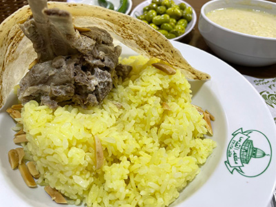 マンサフは、ヨーグルトで煮込んだラム肉と米を発酵乳のソースと一緒に食べるヨルダンの国民食です。