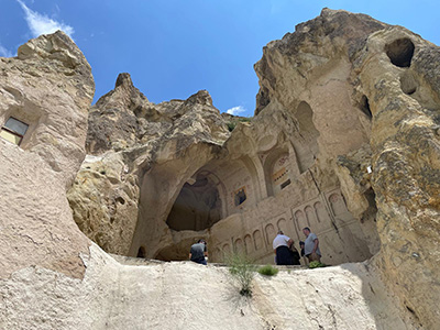 岩を削って造られた無数の教会跡や住居跡が、褐色の斜面に点在しています。